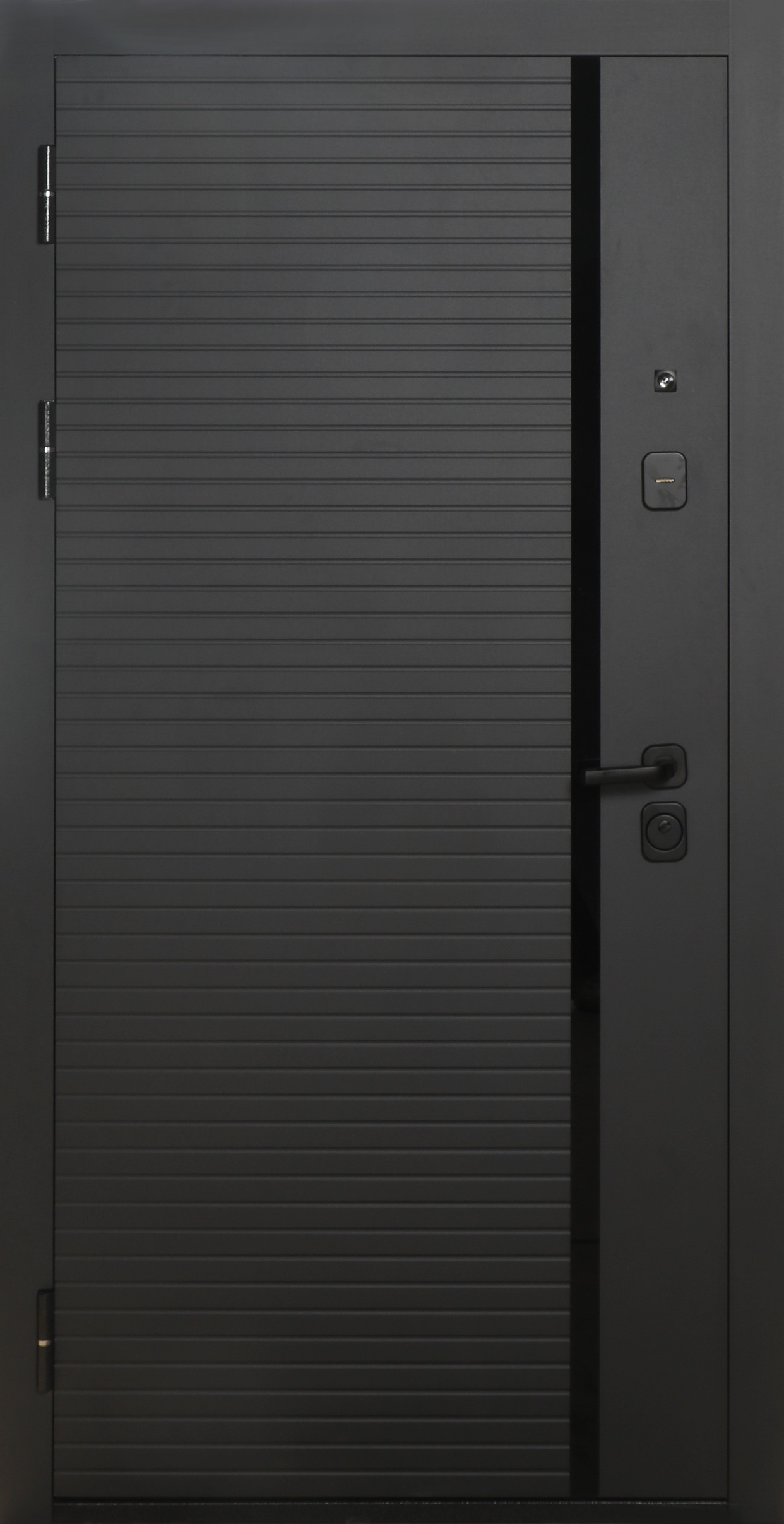 Внешняя отделка: МДФ панель (10 мм) в цвете “Графит” + вставка черное стекло;